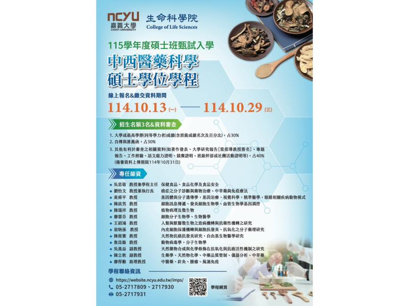 學程另有黃舜平醫師、陳瑞祥教授、陳政男教授、陳立耿副教授等多位優秀師資,歡迎對於中西醫藥科學研究有興趣的學子與各界人士,一起加入嘉大學程的中醫藥研究,讓中華民族中醫藥寶庫在醫藥科學應用發揚光大。