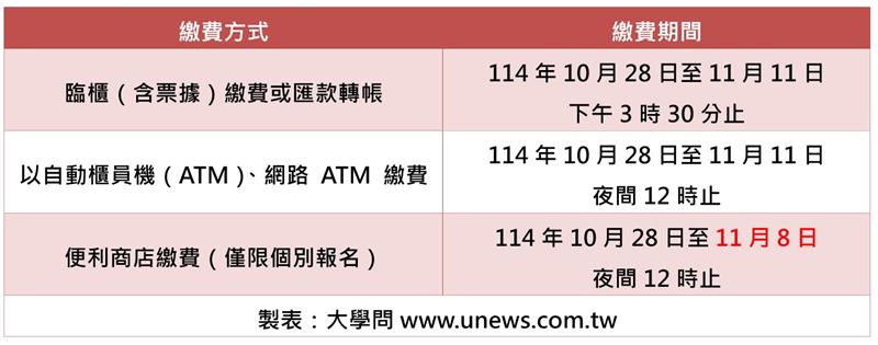 個別報名的考生於報名系統登錄資料後,持印出的「個別報名繳費表」即可繳費。繳費收據請妥善留存備查。【繳費方式與期限】