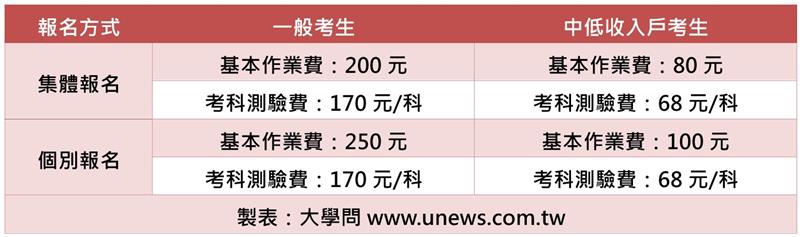 報名費包括「基本作業費」及「考科測驗費」兩項。集體報名的基本作業費每人200元;個別報名的基本作業費每人250元;考科測驗費則每一科皆為170元。中低收入戶考生則減免60%。