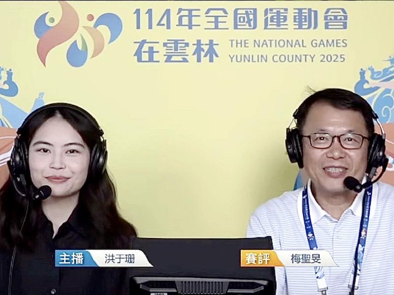 南華大學首啟SNG車轉播全國運動會軟式網球,邀請資深體育主播梅聖旻擔任球評與學生主播大二洪于珊聯手播報賽事。
