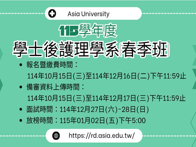 亞洲大學115學年度學士後護理學系[春季班],報名開跑!報名/繳費時間:114.10.15(三)-12.16(二)下午11:59分止面試時間:114.12.27(六)~28(日)*[依公告為主]放榜時間:115.01.02(五)下午5:00