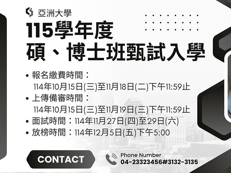亞洲大學115學年度碩、博士班甄試入學,報名開跑!報名/繳費時間:114.10.15(三)-11.18(二)下午11:59分止面試時間:114.11.27(四)-29(六)*[依公告為主]放榜時間:114.12.05(五)下午5:00