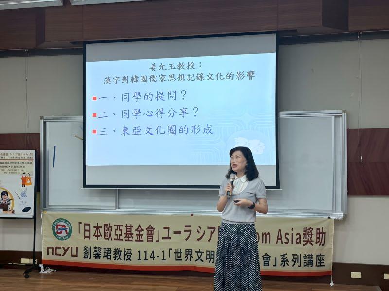 嘉義大學積極推動通識教育國際化,由劉馨珺教授開設的「世界文明與當代社會」課程,結合日本歐亞基金會(?????財團 from Asia)補助,打造跨文化學習平台。系列講座第6場10月21日在民雄校區教育館舉行,活動播放姜允玉教授演講影片,主題為《漢字與儒家思想對韓國文化記錄的深遠影響》。