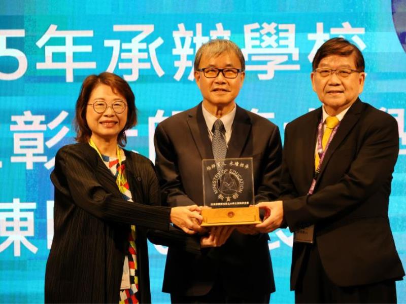 圖2:彰化師範大學陳明飛校長在教育部鄭英耀部長見證下接下由嘉義大學林翰謙校長親自設計的信物。