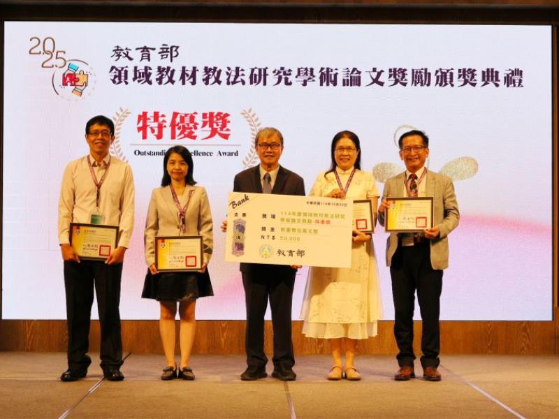 圖4:鄭英耀部長與榮獲「領域教材教法人才培育計畫論文獎勵」特優獎教師合影。
