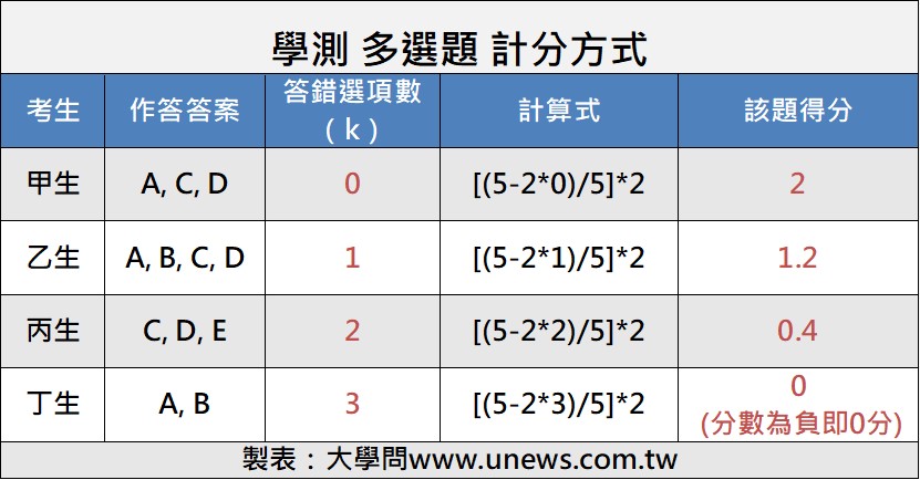 多選題的計分方式是「各項獨立計分」,答對所有選項才能得全部分數;答錯無倒扣,最低分為0分。計分原則如下:*全部答對:得該題全部分數。