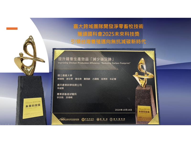 嘉義大學動物科學系陳國隆教授跨領域研究團隊,以具「淨零減碳 × 無抗養殖 × 農業廢棄物高值轉化」特色的精準發酵技術,榮獲2025「未來科技獎」。頒獎典禮10月18日在臺北世貿一館舉行,由國科會主委吳誠文親自頒獎,該技術已完成實場驗證、具臺灣畜牧場即刻落地應用能力,將引領臺灣養殖邁向無抗減碳新時代。