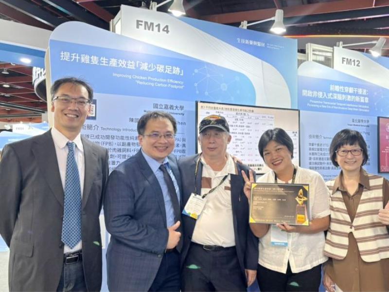 本次獲獎「提升雞隻生產效益『減少碳足跡』」技術,由陳國隆教授領軍,匯集嘉大農學院、生命科學院及理工學院跨學院師資,並與農業部畜產試驗所及嘉禾農業科學公司合作,核心成員包括謝佳雯副教授、魏佳俐副教授、蕭雅齡博士生、古國隆教授、翁博群教授、朱紀實教授、李越勝博士、李宗育博士及洪靖崎博士等,為跨研究與實務端校內外整合型團隊。團隊成員並於10月16日至18日參與「臺灣創新技術博覽會」,於世貿一館設置技術展示攤位,現場吸引多家國內飼料廠與大型畜牧業者主動洽詢合作模式。廠商及業者均表示,該技術不僅具替代進口魚粉的高度潛力,同時能回應日益嚴格的無抗養殖規範,是「少數真正跨出實驗室階段的解方」。