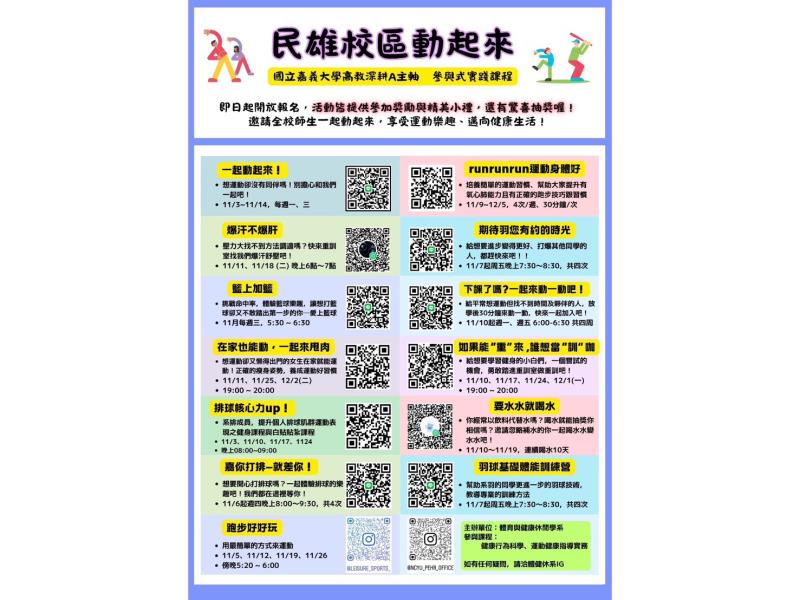 各組活動於11月陸續展開,地點涵蓋民雄校區樂育堂、操場及健身房等校內空間,讓民雄校區成為充滿活力的健康運動園地。每項活動並提供參加獎勵與精美小禮,還有抽獎驚喜。「民雄校區動起來」系列活動即日起開放報名,邀請全校師生一起動起來,享受運動樂趣、邁向健康生活!