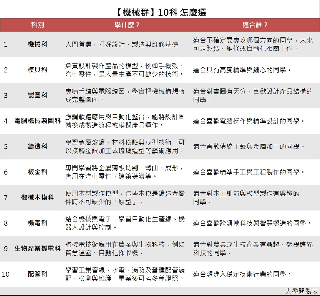 機械群包括:機械科、模具科、製圖科、電腦機械製圖科、鑄造科、板金科、機械木模科、機電科、生物產業機電科、配管科,專攻方向不同,可依興趣選擇。