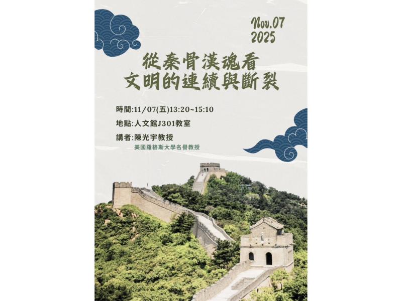 嘉義大學應用歷史學系11月7日(星期五)13時20分於民雄校區人文館J301教室舉辦專題演講,此次演講特別邀請美國羅格斯大學陳光宇名譽教授主講「從秦骨漢魂看文明的連續與斷裂」,自由入場,誠摯邀請各界踴躍蒞臨參加。