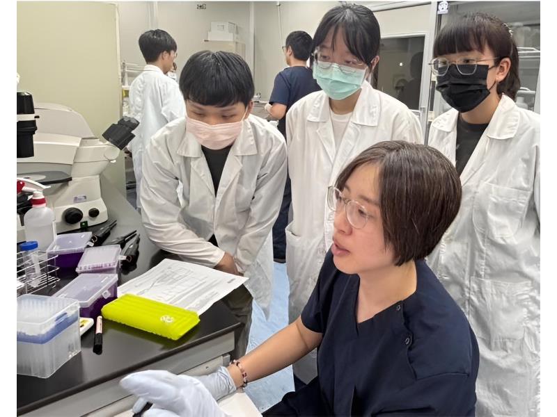 ◆ 製藥工程系學生於實驗室進行操作訓練,教師現場指導實驗步驟與分析技巧,展現專業實作與研發能力。