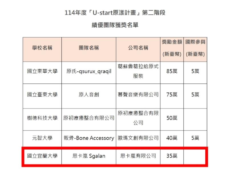 國立宜蘭大學育成中心輔導團隊「思卡嵐Sgalan」 勇奪U-start原漾計畫績優團隊補助 收藏