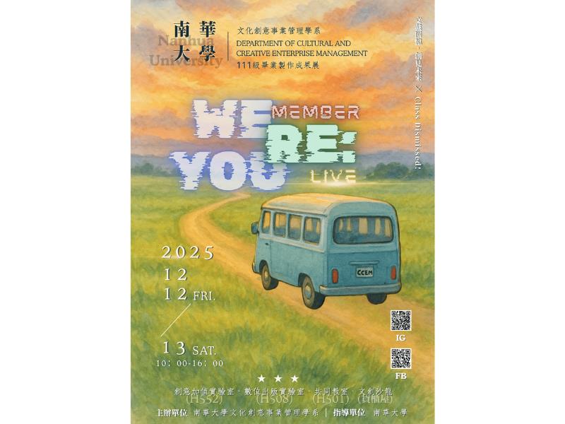 南華大學文化創意事業管理學系111級畢業專題展《We Re: member; You Re: live》將於12月12日至13日登場,誠摯邀請校友於週五、週六兩天返校共襄盛舉。本屆策展主題為文創系歷屆學習成果與創意展現的回顧與總整,並以兩個子主題形式呈現:「文載回憶,創見未來」與「Class Dismissed!」,透過辦桌文化與課程闖關,共同襯托教育歷程中記憶、實作與創造的多重價值。歡迎各界人士、社會大眾蒞臨參觀指導,見證學子的學習成果。