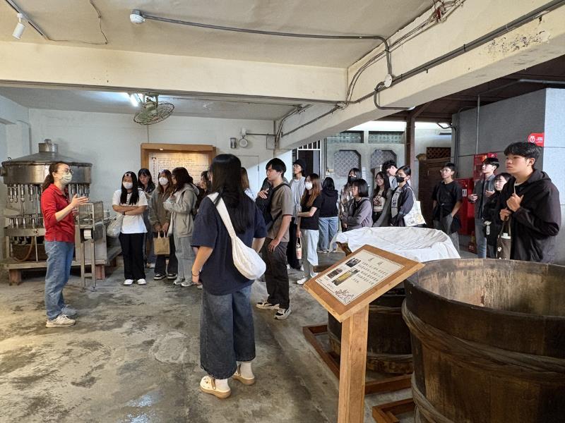 此次活動首站,首先參訪有百年歷史的丸莊食品工業股份有限公司,該公司為台灣傳統釀造醬油的重要品牌,致力於保留古法釀造工藝並結合現代技術與觀光推廣。學生透過專業導覽的介紹,更加瞭解醬油的製程、豆麴發酵與釀造文化的演變歷史,並親身體驗傳統釀醬工具操作,感受時間淬鍊出的風味藝術。導覽中也介紹「丸莊醬油」如何將醬油文化轉化為文化商品,拓展國際市場,展現傳統產業創新轉型的典範。