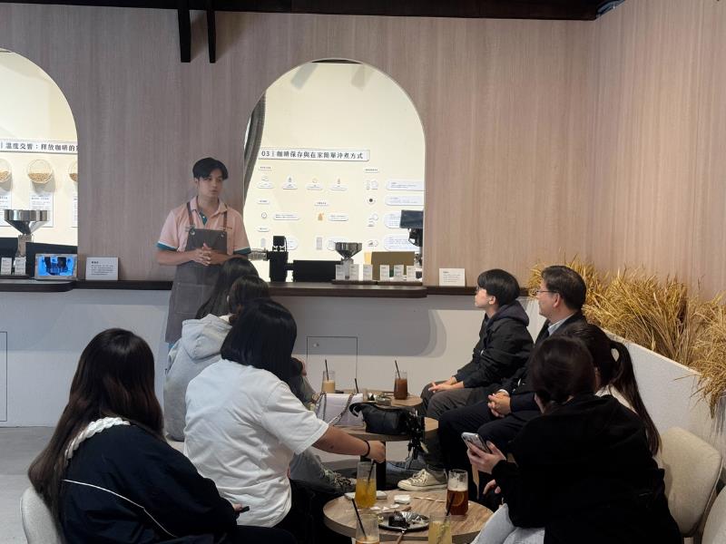 南華大學企管系至十果文創園區參訪,學生聆聽園區內咖啡梅納館創辦人陳柏廷介紹創業理念與經營模式。