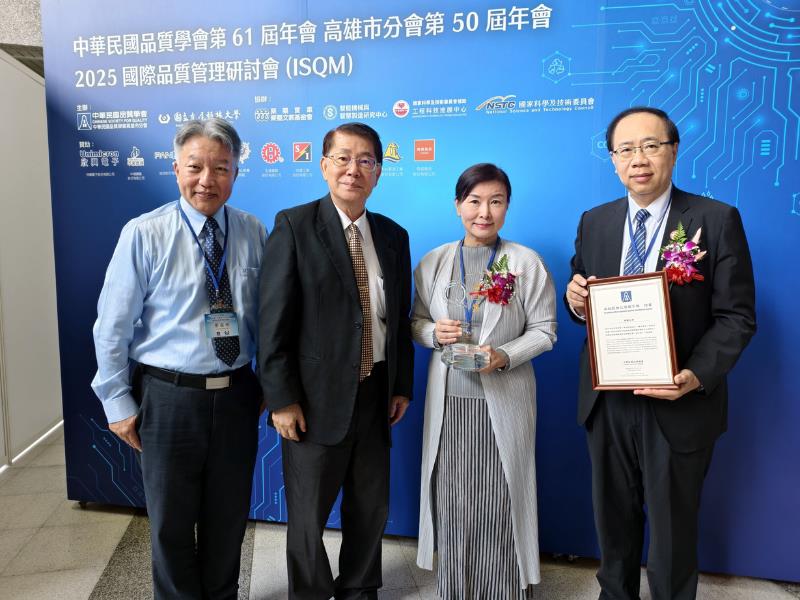 南華大學榮獲2025卓越經營品質獎「標竿獎」,副校長賴淑玲(右2)與主任秘書兼研發長胡聲平(右1)代表學校接受表揚,左2為中華民國品質學會秘書長陳介山。
