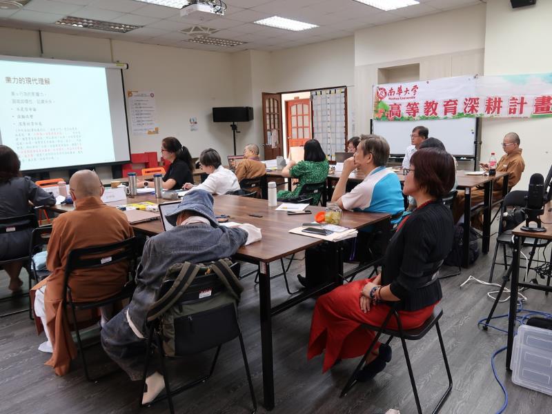 該講座由人間佛教數位學習碩士在職專班教授李芝瑩主持,由教育部指導、南華大學高教深耕計畫辦公室主辦,人文學院、宗教學研究所及人間佛教數位學習碩專班共同協辦。