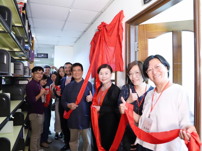 南華大學文學系舉辦國際研討會,啟用「敦煌學專區」深化研究能量。南華大學賴淑玲副校長(右3)、榮譽教授、敦煌學專家鄭阿財教授(右4)、敦煌學研究中心廖秀芬主任(右2)及貴賓一同揭牌。