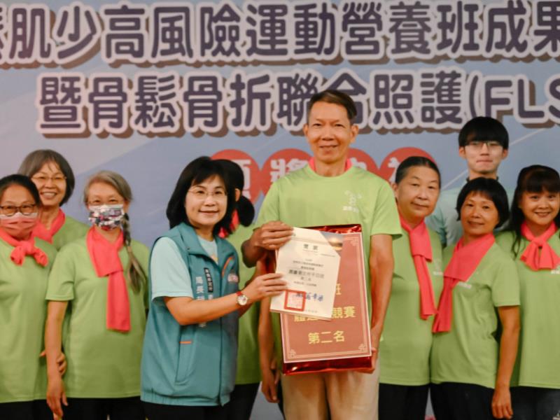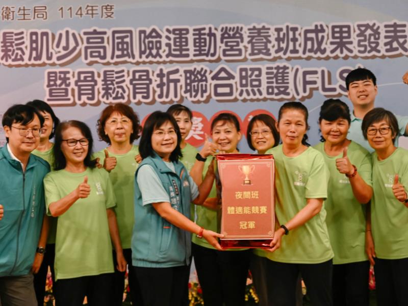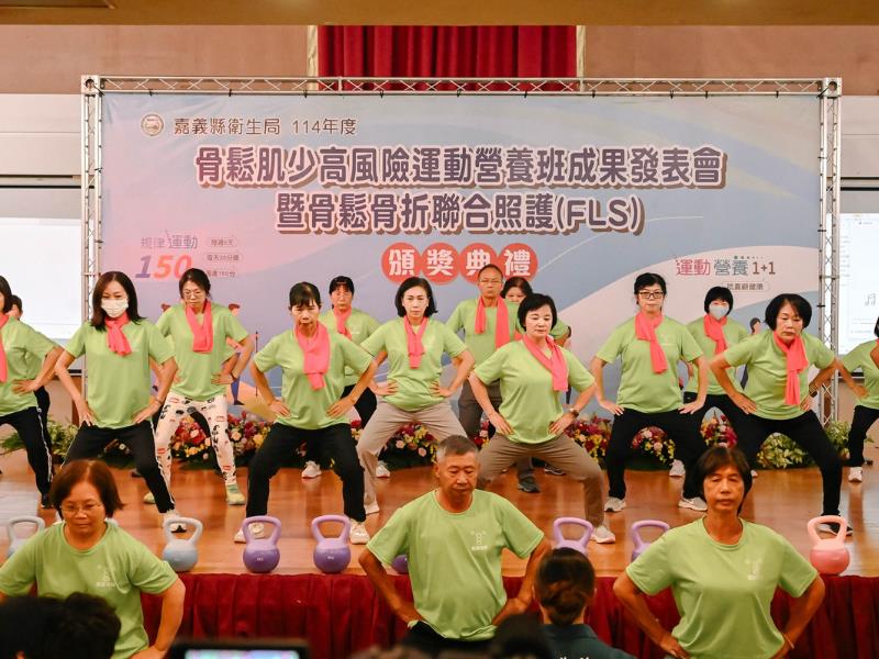 114年嘉義縣骨鬆肌少高風險運動營養班於11月15日舉行成果展,並同步辦理嘉義縣骨鬆骨折聯合照護(FLS)各衛生所頒獎典禮。縣長翁章梁、衛生局長趙紋華、中華民國骨質疏鬆症學會陳崇桓常務理事、大林慈濟醫院與嘉義長庚醫院專家、地方民意代表等貴賓皆蒞臨支持。成果展以研討會形式呈現,共製作50面海報看板,展出計畫理念、團隊介紹、20班成果數據、指導員課程分享及多則學員故事;活動亦頒發「大腿肌力進步獎」、「規律運動獎」,並安排太極八段錦展演、體適能競賽與學員現身說法,展現300多位學員的努力成果。該計畫以「創新嘉義健康新未來—骨鬆肌少聯合照護」入圍行政院政府服務獎,展現縣府與南華大學合作成效。