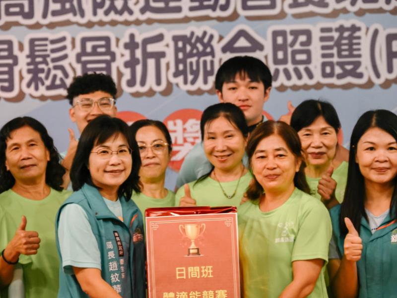 南華大學執行嘉義縣骨鬆肌少運動營養班,新港鄉衛生所榮獲日間班體適能競賽獎第三名,由趙紋華局長(前排左2)頒獎。