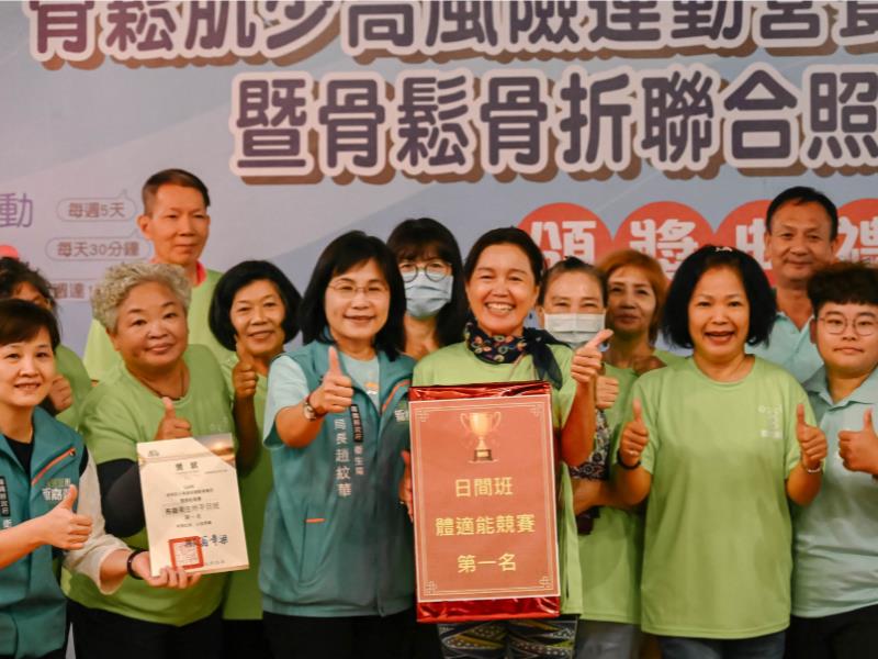 南華大學執行嘉義縣骨鬆肌少運動營養班,民雄鄉衛生所榮獲日間班體適能競賽獎第二名,由趙紋華局長(前排左3)頒獎。