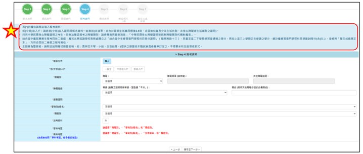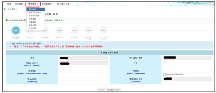 登入後,在「考生專區」處選擇「個人報名」,確認「姓名」、「身分證字號」、「出生年月日」等無誤後,可開始填寫報名資料。【1.填寫資料】