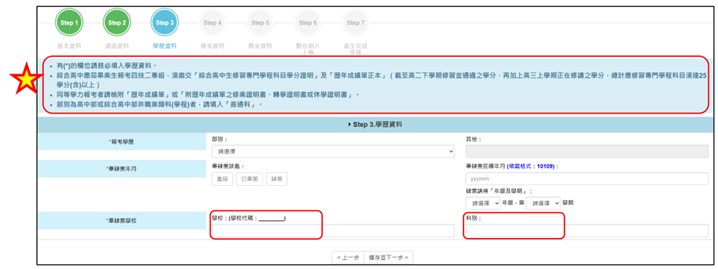*注意:綜合高中應屆畢業生若報考四技二專組,須繳交修習專門學程科目25學分以上的學分證明和歷年成績單。