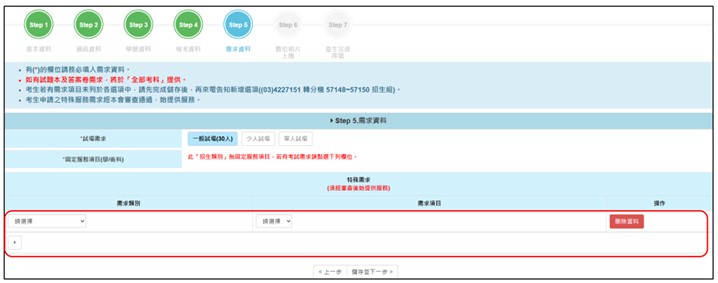 若有特殊需求,如試場需求、試題需求、答案卷需求、試場提供服務或輔具、自備輔具等,可於此處填寫需求服務。考生申請的特殊需求經委員會審查通過後才提供。