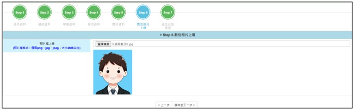 請上傳114年1月1日以後拍攝的數位相片,須為彩色且背景為白色或淺色的脫帽正面大頭照,不能佩戴深色鏡片眼鏡。不能使用生活照或相片掃描翻拍或合成照片。相片檔請以PNG、JPG、JPEG 儲存,大小須在2MB以內。