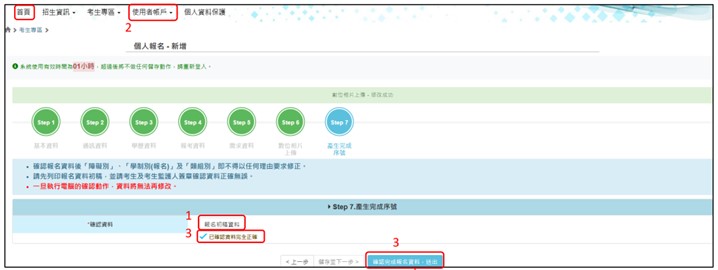 1.報名資料填寫完成後,請點選「報名初稿資料」,確認內容是否有誤。若有錯誤,請點選「考生專區」的「個人報名」,進行報名資料修改。2.若暫不確認報名,可點選「首頁」或「使用者帳戶」選擇「登出」,離開系統。