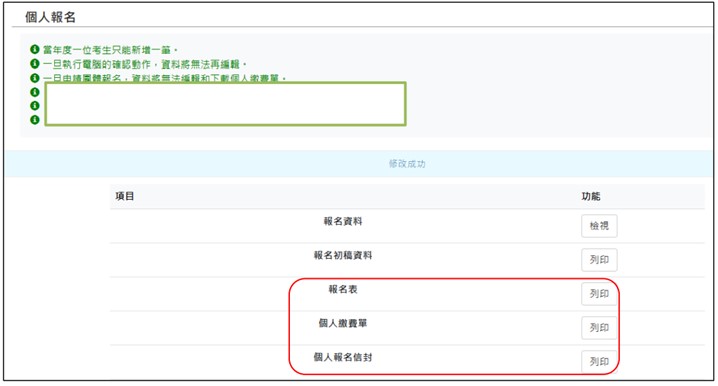 報名完成後,請點選「考生專區」的「個人報名」,列印「報名表」、「個人繳費單」、「個人報名信封」,並依繳費單說明方式完成繳費,在報名截止前寄出報名資料。