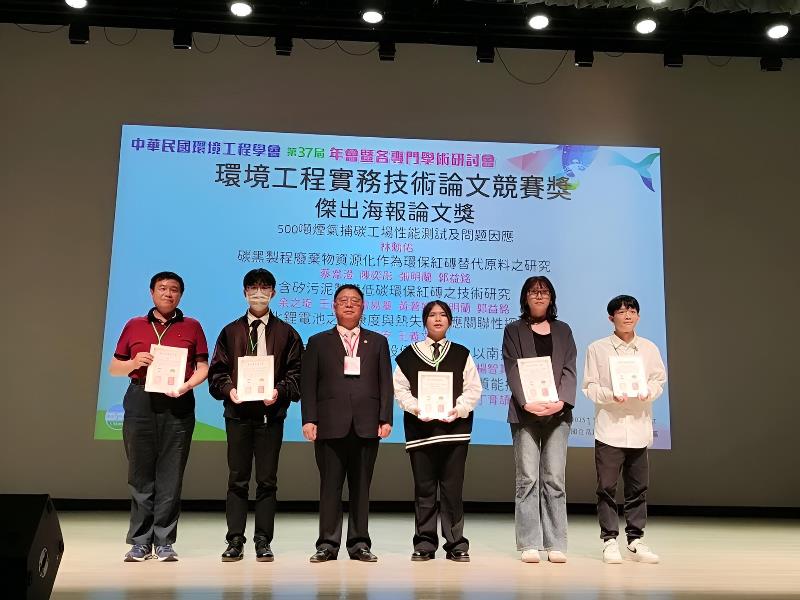 其中,郭益銘教授團隊以「環保紅磚資源化製作技術」為主題,榮獲兩篇「114年度環境工程實務技術研討會傑出海報論文獎」,成果獲評審高度肯定。