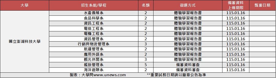 「大學問」(www.unews.com.tw)將各校系的甄選方式和重要日期整理出來,想要申請的同學,請留意各校系的甄選方式和備審資料上傳截止日,以及甄試日期,並下載簡章詳細閱讀招生條件。高一高二生也可先了解一下相關資訊,為將來升學時預作準備。