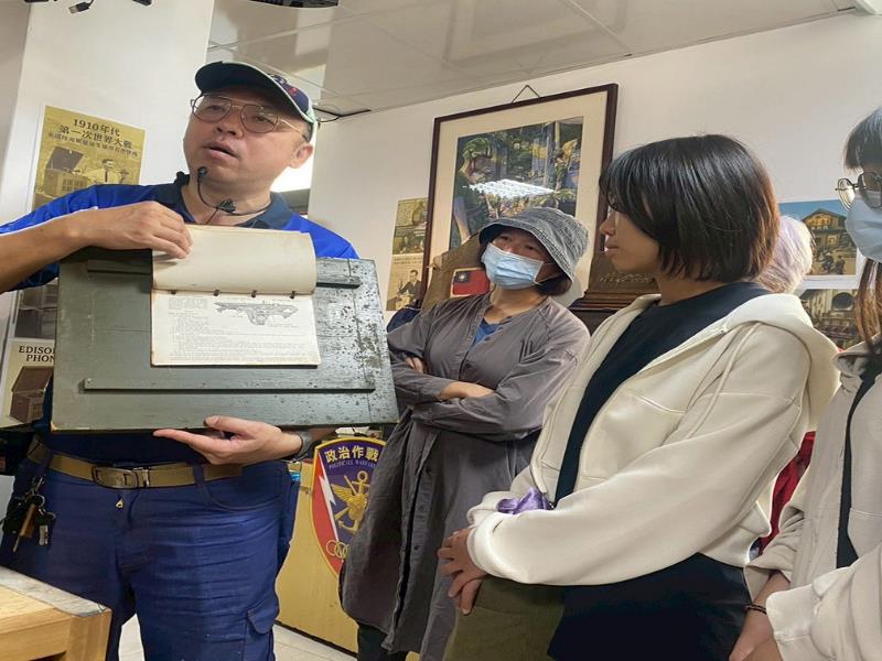 旅程緊接著來到「萬國戲院」與「成都旅社」。萬國戲院雖因修繕而未對外開放,但為避免這座文化地標在整修期間被遺忘,江明赫老師特別在旁設置展示工作室,陳列留聲機、唱片與戲劇器具等珍貴收藏,並示範解說,讓參與者得以貼近戲院所承載的集體記憶。他也透露未來戲院將規劃「夜宿功能」,使更多民眾能以嶄新方式認識大林文化。走進成都旅社時,江明赫老師以幽默風趣的講述方式分享旅社的歷史軼事,使參與者在笑聲中感受昔日大林的社會氛圍。