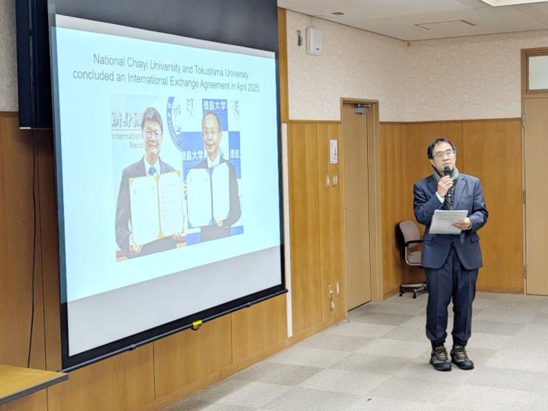嘉義大學與日本德島大學(Tokushima University)今(114)年4月15日正式簽署學術合作協議及學生交換合作備忘錄,締結姊妹校關係。10月30日至11月2日,嘉大生命科學院師生前往德島大學生物資源產業學院進行學術交流與演講,出訪成員為微生物免疫與生物藥學系劉怡文教授、生化科技學系張心怡教授、微藥系碩二吳佩璇研究生及生化系大三江博弈同學。