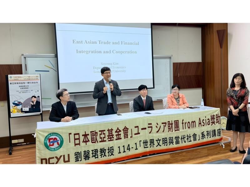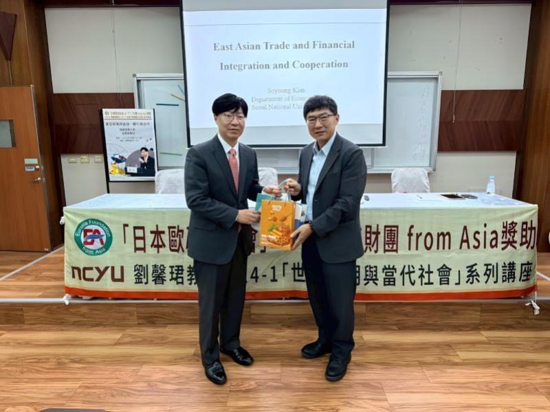 嘉義大學教育學系劉馨珺教授「世界文明與當代社會」課程在日本歐亞基金會的大力支持下,持續打造跨文化、跨學科的全球視野學習平台。11月18日課程再度迎來國際級重量講者-韓國首爾大學金素英教授,帶來專題演講《東亞貿易與金融整合和合作》,引導學生深入理解東亞在全球經濟版圖中的戰略地位與發展趨勢。
