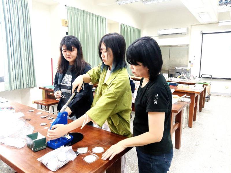 圖1:陸蕙萍老師指導學生壓製胸章之技巧。