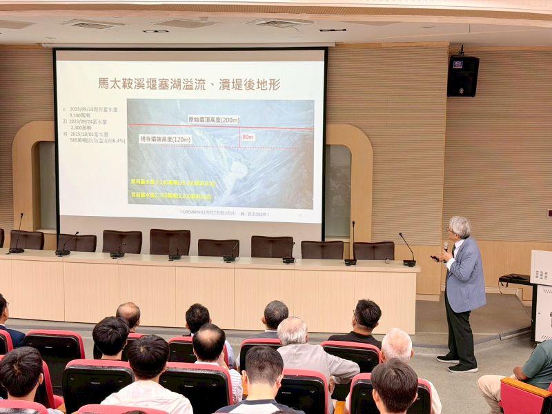 活動首先由李咸亨教授以「從馬太鞍溪堰塞湖看低碳環保綠色大學的重要性」為題,馬太鞍溪堰塞湖的形成、演變到潰堤過程,透過衛星影像、水位變化紀錄與專家評估資料,逐步拆解臺灣山區災害的複合成因。李教授指出,此次事件源於2024年花蓮地震造成邊坡鬆動,並在2025年連續颱風豪雨下累積巨量蓄水,最終於樺加沙颱風期間溢流潰堤,對光復鄉造成農地掩埋、道路沖毀等重大衝擊,凸顯極端氣候下臺灣中高山地區的高度脆弱性。