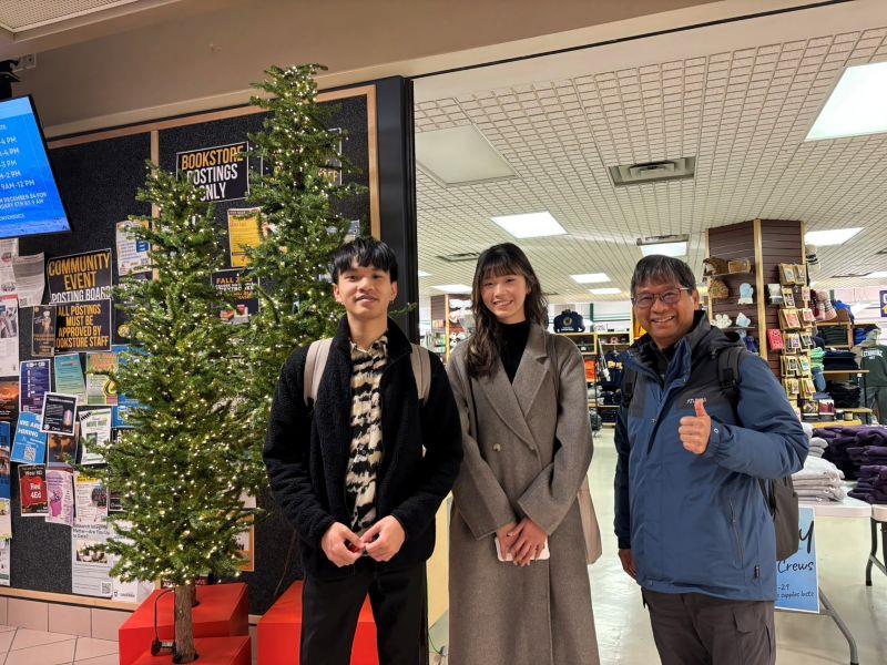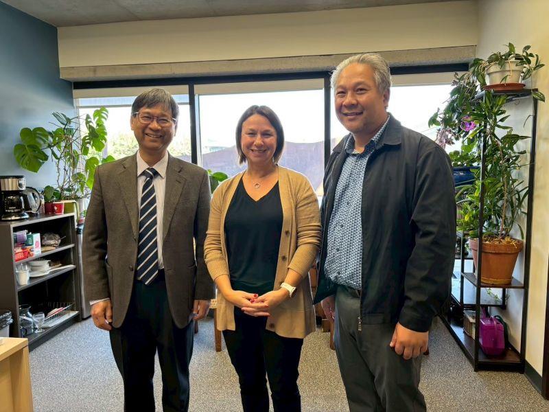 圖1:張俊賢教授訪視目前於加拿大萊斯布里奇大學交換的林呈衛(左)及藍云希(中)兩位學生。