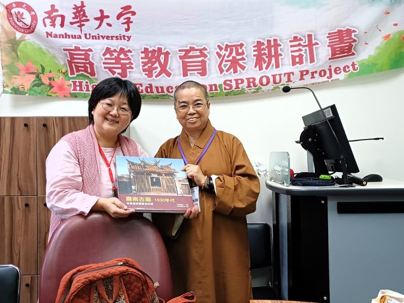 南華大學人間佛教學術講座邀請華梵大學佛教藝術學系王惠雯教授(左)演講,解析《玉耶女經》的意涵,宗教所所長覺明法師(右)致贈嘉南古廟珍貴歷史圖像全紀錄。