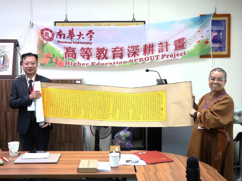 南華大學人間佛教學術講座邀請國立成功大學嚴瑋泓教授(左)詮釋《金剛經》,宗教所所長覺明法師(右)致贈金剛經卷軸。