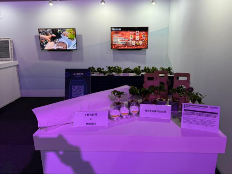 圖二、利用回收纖維製備環保生物可分解地膜以取代傳統塑膠農膜,並結合圖壤改良劑研發與導入,從農廢資源循環再利用出發,以高值化為目標,為鴻海科技日(HHTD25)帶來豐碩的成果與禮品。