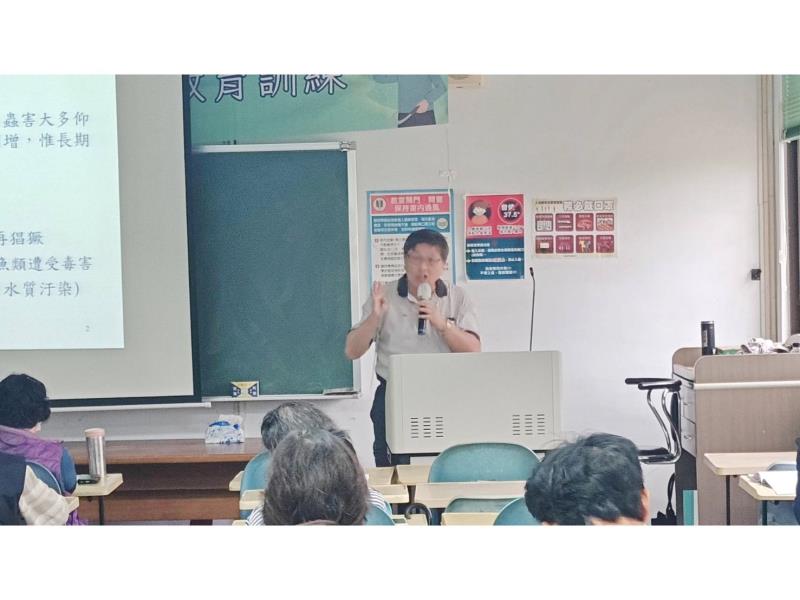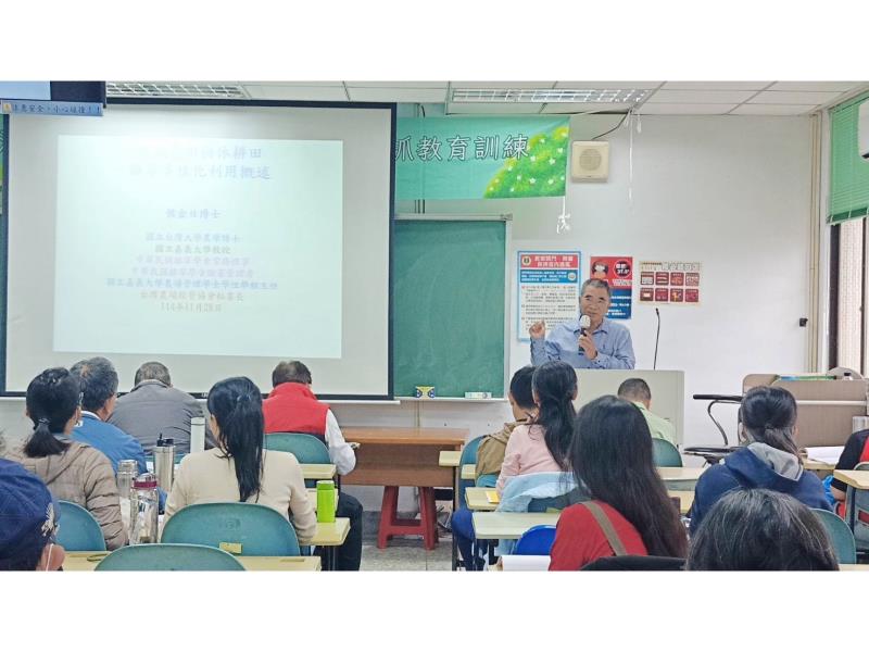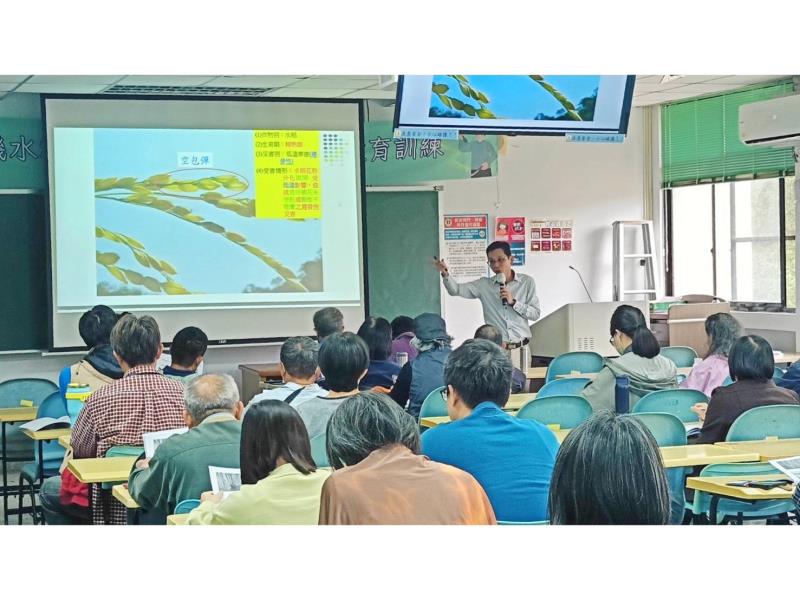 有機農田與休耕田雜草多樣化利用教育訓練,課程內容實用性高,首先由侯金日主任講述「有機農田與休耕田雜草多樣化利用概述」,內容包括雜草可作為景觀野花、野菜、藥草、牧草、草坪、綠肥、染料及水土保持植物,涵蓋八大類別,述說雜草確實具多樣化功能與用途,只是部分功能與用途尚未被發覺而未能加以利用。其次為「雜草作為香藥用植物之生產與利用」,由農藝學系柯金存博士講授,介紹決明子、兔兒菜、山香、青箱、巴參菜、咸豐草、野莧菜、龍葵、雞屎藤、甜珠草、馬齒莧、魚腥草、金錢薄荷、馬蘭、艾草、酸模、霍香薊、過溝菜蕨、菁芳草、黃花酢漿草、月桃、牛筋草、香附子等20多種雜草作為藥用植物之利用效果。「有機農田病蟲害管理與有機農田土壤管理之增碳策略」則由黃啟鍾教授及陳楷岳博士講授。有機水稻栽培技術報名人數達80位,講授一般栽培技術、肥培管理技術、病蟲害管理技術與雜草管理技術,兩天教育研習皆安排1小時結合電腦與手機資訊進行農務e把抓有機種植登記操作,讓農民不只會種植有機作物還會上網登錄。