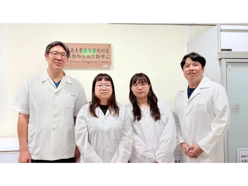 圖3:嘉大獸醫學院吳瑞得院長(左一)、非洲豬瘟初篩實驗室負責人郭鴻志教授(右一)與負責非洲豬瘟檢測工作的獸醫師合影。
