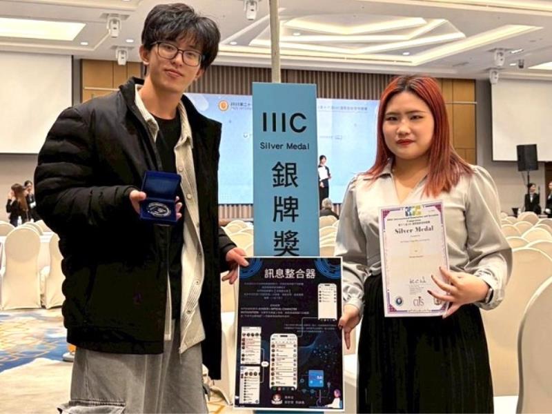 兩項銀牌作品同樣展現創新實力。資工系郭安堤與吳靜儀的作品「訊息整合器」運用軟體工程與AI技術,打造跨來源資料自動整合平台,解決資訊分散與人工整理的問題。郭安堤分享:「勇於嘗試、持續反覆驗證想法比完美的起點更重要。」吳靜儀則認為,競賽讓團隊學會如何將技術敘述成能被評審理解的故事,這是課堂上難以獲得的寶貴經驗。