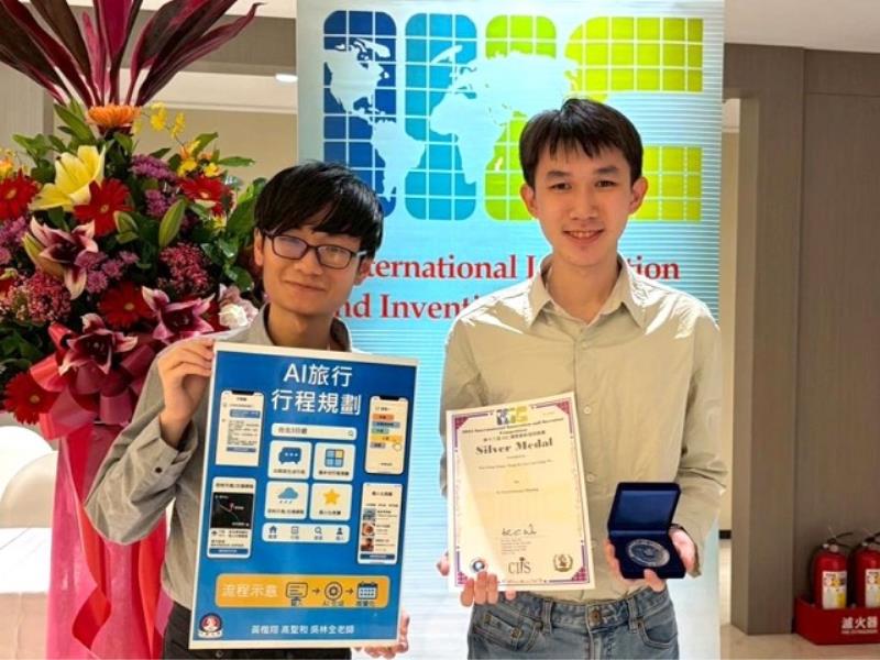 ▲資工系黃楷翔與高聖和以「AI旅行行程規劃」獲得銀牌獎,並表示希望透過AI技術,讓旅遊規劃更智慧、更自由,提升使用者體驗。