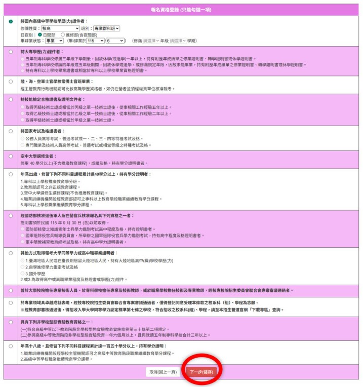 3.接著進入填寫學歷(力)資格項目,請考生依所持有的學歷(力)證明勾選。報名資格登錄僅能勾選一項。勾選完畢請按「下一步(儲存)」。