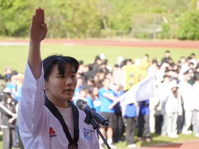 ▲114學年度運動會由光電與材料工程學系盧姵伃擔任運動會宣誓代表,曾勇奪弘光盃全國大專跆拳道錦標賽冠軍,展現堅毅與榮耀!