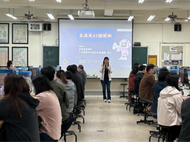 本次課程由資策會專業講師授課,以「實務應用」為核心,內容涵蓋AI基礎概念、提示詞(Prompt)精準設計技巧、文字與圖像生成操作,並深入探討AI倫理與法律相關議題。課程採理論與實作並重的方式,引導學員將AI工具實際導入行政文書處理、教學教案設計、簡報製作及資料分析等場景。透過系統化的學習,教職員工不僅有效提升了工作效率,更激發出多元的創新應用能力。